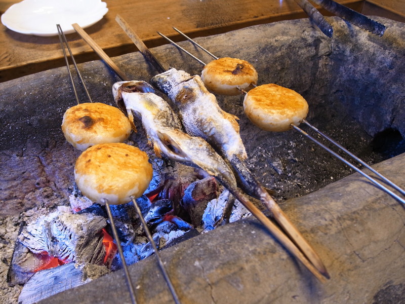 その上で山魚の"あまご"と"いももち"を炭火で焼いてくれます。